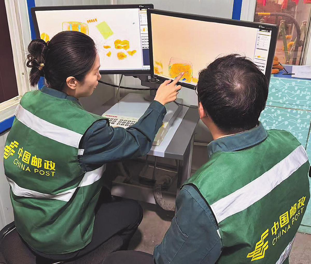 圖為濟(jì)南郵政工作人員對進(jìn)京郵件進(jìn)行二次過機(jī)安檢。