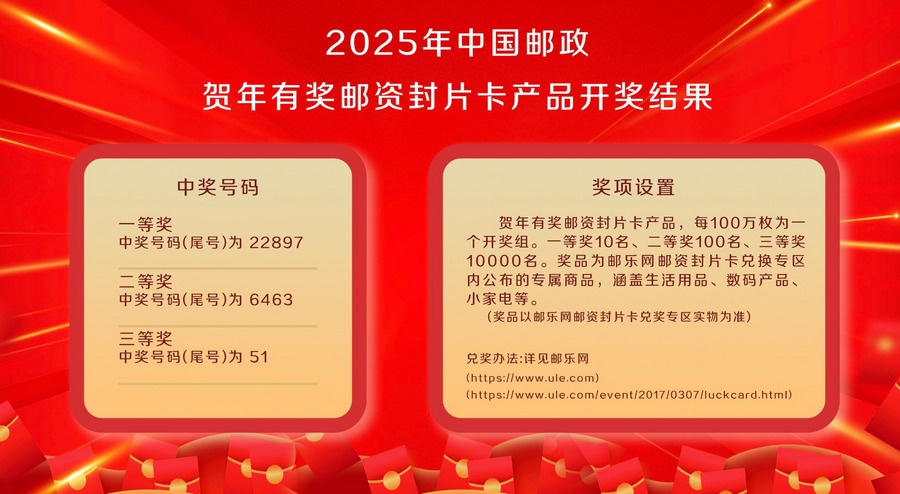 3月24日,2025年中國郵政賀年有獎郵資封片卡產(chǎn)品開獎結(jié)果產(chǎn)生。賀年有獎郵資封片卡產(chǎn)品每100萬枚為一個開獎組,每個開獎組設3個獎項。獎品為郵樂網(wǎng)郵資封片卡兌換專區(qū)內(nèi)公布的專屬商品,涵蓋生活用品、數(shù)碼產(chǎn)品、小家電等,以郵樂網(wǎng)郵資封片卡兌獎專區(qū)實物為準。