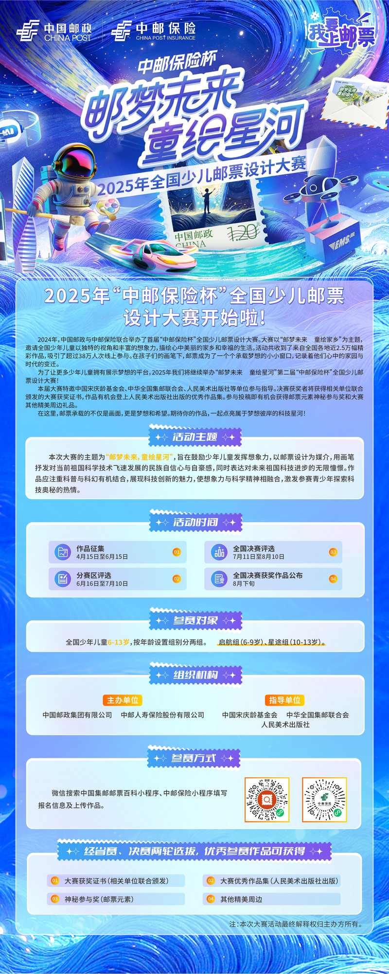 本次大賽的主題為“郵夢未來,童繪星河”,旨在鼓勵少年兒童發(fā)揮想象力,以郵票設(shè)計為媒介,用畫筆抒發(fā)對當(dāng)前祖國科學(xué)技術(shù)飛速發(fā)展的民族自信心與自豪感,同時表達對未來祖國科技進步的無限憧憬。作品應(yīng)注重科普與科幻有機結(jié)合,展現(xiàn)科技創(chuàng)新的魅力,使想象力與科學(xué)精神相融合,激發(fā)參賽青少年探索科技奧秘的熱情。