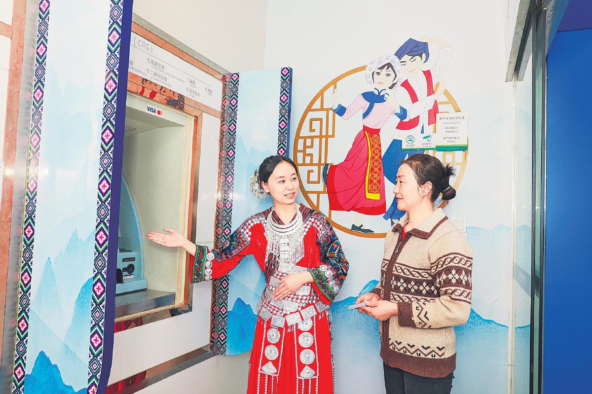 在青石板街的盡頭,陽光斜斜地灑在濯水鎮(zhèn)支行裝飾的“西蘭卡普”花紋上,赭紅與靛藍(lán)交織的花紋與遠(yuǎn)處風(fēng)雨廊橋的飛檐翹角遙相呼應(yīng)。走進(jìn)支行,濃郁的民族風(fēng)情撲面而來?!澳崦珊茫茫 鄙碇良易鍌鹘y(tǒng)服飾的郵儲員工用方言向客戶問好。