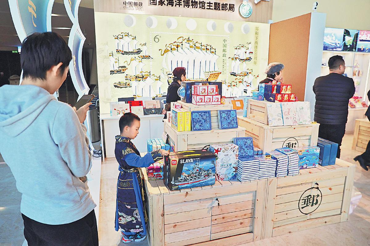 國(guó)家海洋博物館主題郵局是國(guó)內(nèi)首個(gè)海洋主題郵局,也是第一個(gè)啟用主題郵局日戳的郵局。對(duì)于喜歡在旅行中留下回憶的集郵愛(ài)好者劉先生來(lái)說(shuō),這里是他來(lái)國(guó)家海洋博物館的必打卡地。劉先生在主題郵局內(nèi)集齊了所有紀(jì)念戳,足足蓋了幾頁(yè)紙,購(gòu)買(mǎi)的主題文創(chuàng)產(chǎn)品也塞滿(mǎn)了書(shū)包,可嘴里還是念叨著:“沒(méi)逛夠,有機(jī)會(huì)還要再來(lái)?!?/p>