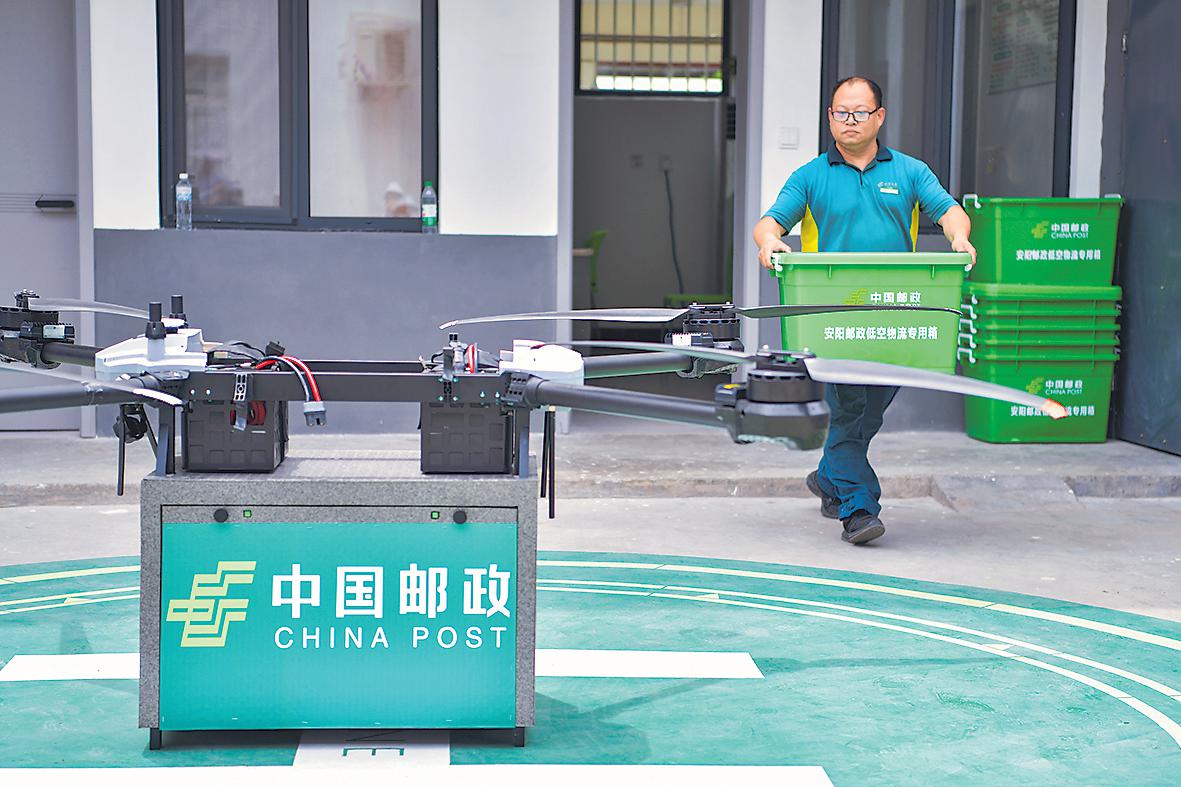6月17日,在河南省林州市石板巖鎮(zhèn)郵政支局,伴隨著螺旋槳的嗡鳴聲,一架載重50公斤的無(wú)人機(jī)從停機(jī)坪騰空而起,載著郵件飛向海拔1300米的上坪村。7分鐘后,隨著無(wú)人機(jī)在上坪村的郵政低空物流驛站穩(wěn)穩(wěn)降落,河南首條無(wú)人機(jī)山區(qū)郵路正式投入常態(tài)化運(yùn)營(yíng)。