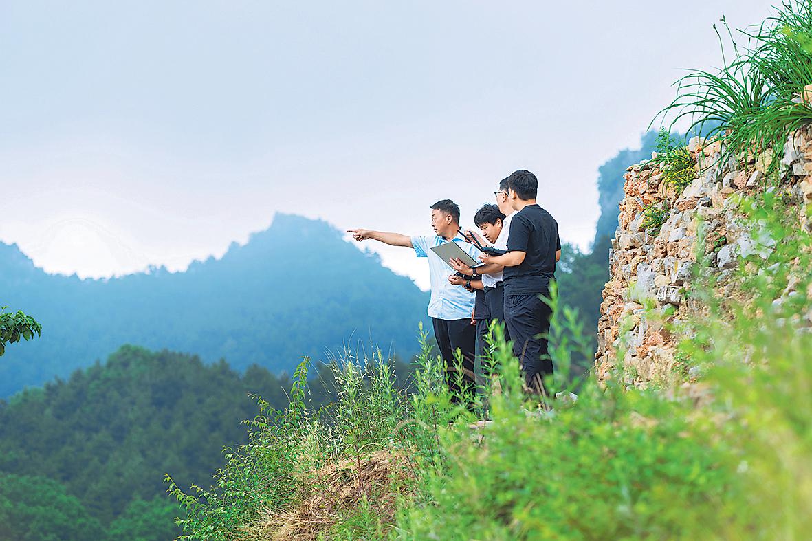 林州郵政工作人員與技術(shù)員在大垴村考察無(wú)人機(jī)起降點(diǎn)。