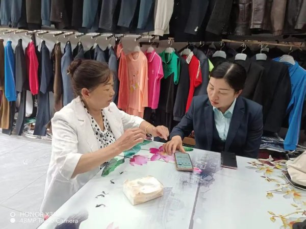 劉明翠為商戶介紹產(chǎn)品。