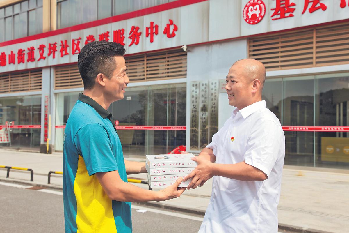 江蘇各地郵政充分發(fā)揮勞模先進(jìn)引領(lǐng)作用,持續(xù)拓展《習(xí)近平談治國(guó)理政》第五卷發(fā)行的深度和廣度。徐州市郵政分公司在各網(wǎng)點(diǎn)積極營(yíng)造圖書發(fā)行宣傳的濃厚氛圍,同時(shí)開(kāi)展“勞模領(lǐng)學(xué)”活動(dòng)。江蘇省勞模、豐縣郵政分公司王溝支局投遞員趙本增帶領(lǐng)“勞模創(chuàng)新工作室”的黨員共同學(xué)理論、悟原理。他還來(lái)到王溝鎮(zhèn)程集村村委會(huì),開(kāi)展政務(wù)圖書發(fā)行宣講活動(dòng)。蘇州市郵政分公司組建重大主題圖書發(fā)行專班,覆蓋征訂、供貨、配送等全流程,嚴(yán)控“安全、及時(shí)、準(zhǔn)確”三大標(biāo)準(zhǔn);優(yōu)化干支線運(yùn)輸銜接,確保圖書第一時(shí)間送達(dá);在線下網(wǎng)點(diǎn)、黨建陣地,發(fā)揮勞模代表和先進(jìn)典型的帶動(dòng)作用,營(yíng)造濃厚的學(xué)習(xí)、宣傳氛圍?;窗彩泻闈蓞^(qū)郵政分公司邀請(qǐng)全國(guó)勞模、退休員工唐真亞深入基層單位開(kāi)展圖書征訂宣傳。在老子山鎮(zhèn)政務(wù)服務(wù)中心的宣講會(huì)上,唐真亞結(jié)合自身25年“水上郵路”的服務(wù)經(jīng)歷,以樸實(shí)生動(dòng)的語(yǔ)言分享了《習(xí)近平談治國(guó)理政》第五卷學(xué)習(xí)感悟,引發(fā)大家的共鳴。宿遷市勞模、宿遷市城區(qū)郵政分公司來(lái)龍支局負(fù)責(zé)人王永震走進(jìn)宿豫區(qū)來(lái)龍鎮(zhèn)光明社區(qū),和社區(qū)黨員一起學(xué)習(xí)《習(xí)近平談治國(guó)理政》第五卷。他結(jié)合書中“扎實(shí)推進(jìn)共同富?!钡膬?nèi)容,分享了宿遷郵政助力鄉(xiāng)村振興的實(shí)踐案例,得到大家的認(rèn)同。