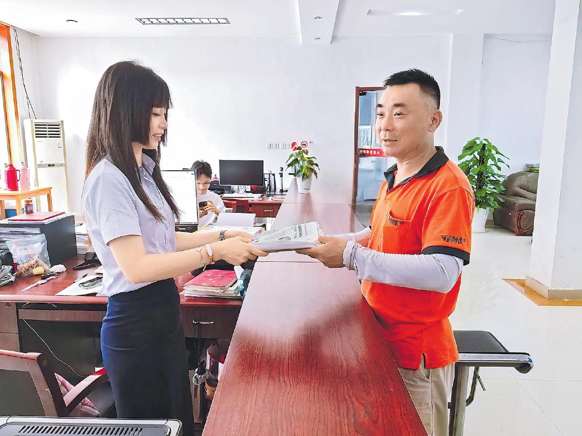 朱紅強(qiáng)(右)為客戶(hù)投遞報(bào)刊。